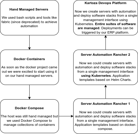 Because our hosting services for customers pre-dated Kubernetes and even Docker, we built up a legacy of around 70 hand-managed servers at its peak. Hand managing servers offers fine-grained control over each host yet has a huge downside of being difficult to scale and manage large numbers of servers. In the last few years we have actively been moving our server workloads over to managed environments backed by an excellent team of DevOps engineers.